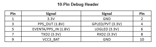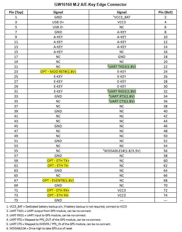 The following tables provide the connector pinouts for the 10-pin debug header and the M.2 A/E-Key connector. Optional signals for the Gateworks adapter are highlighted in yellow and have a “OPT” label. These are no-connects on the standard board model, contact sales for special models with support for these signals. The UART signals highlighted in green are connected to the GNSS module but are not required for module operation and can be no-connects. The 10-pin debug header is a 0.050” dual row thru-hole connector and is not loaded on the standard model but can be easily probed.