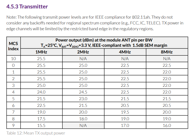 Please note this power output only happens at certain bandwidths and MCS indexes per the MM8108 datasheet in table 4.5.3 labeled Transmitter.
